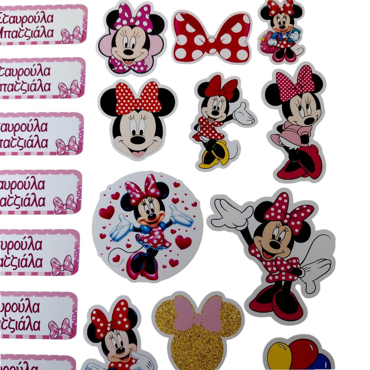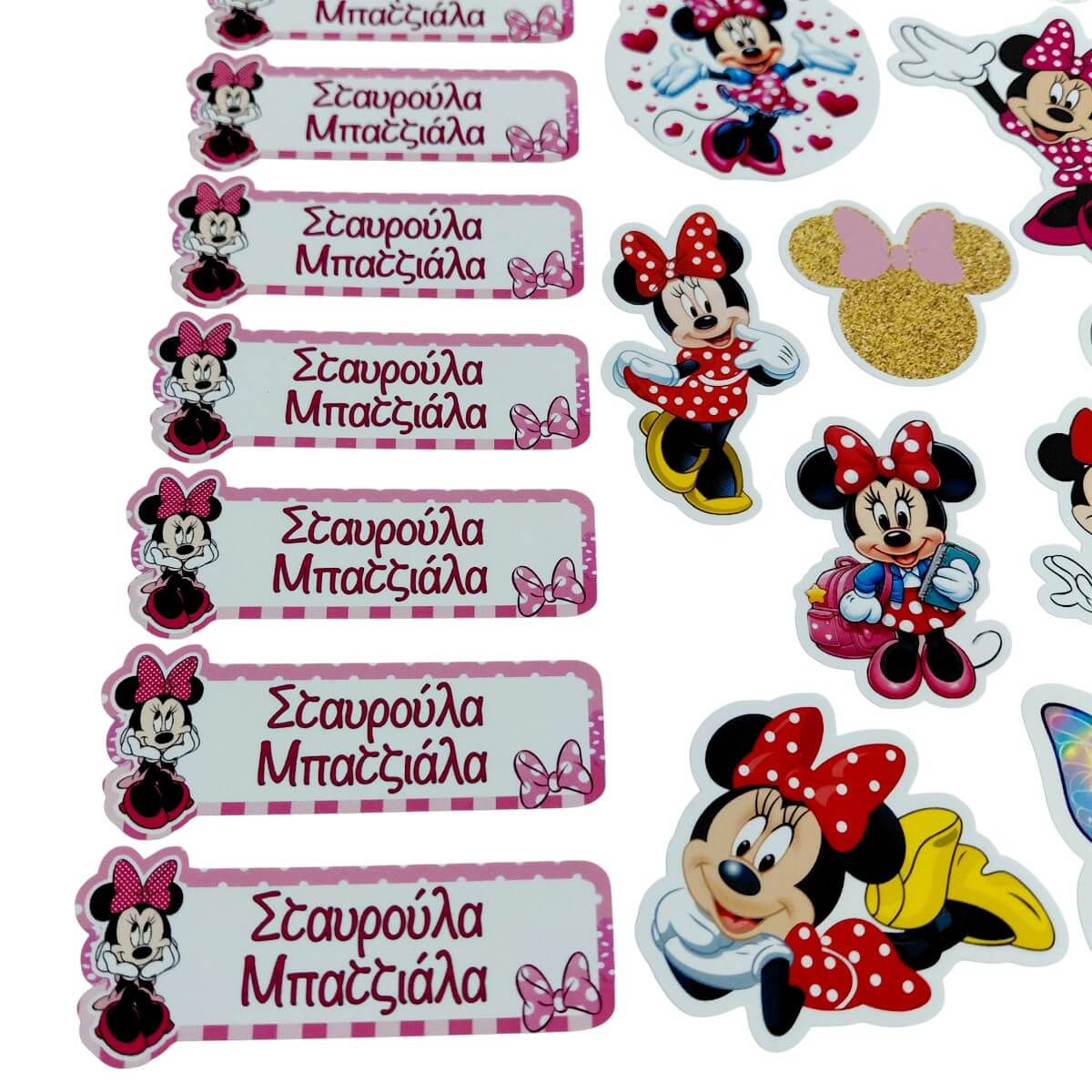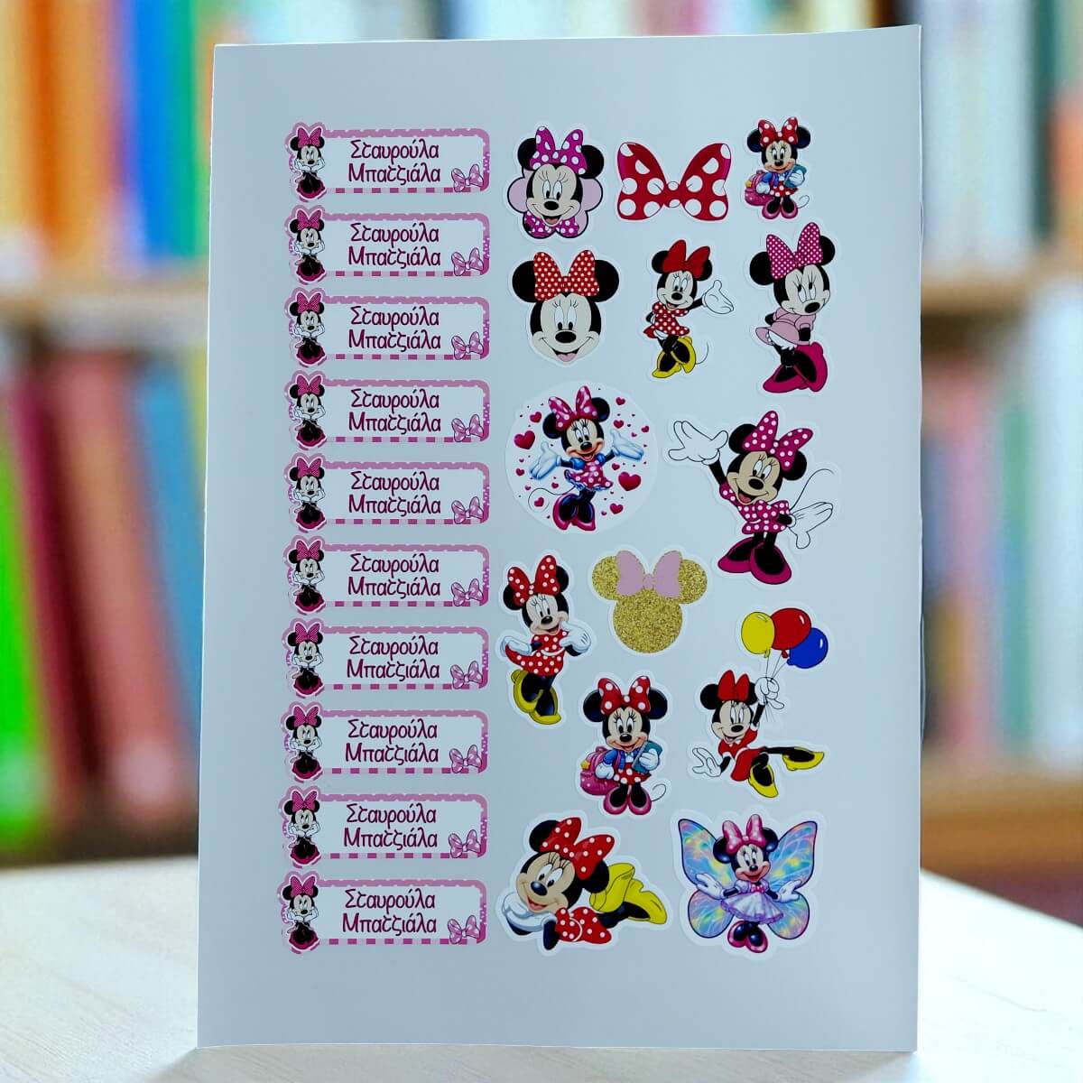 1 σελίδα με 10 ετικέτες που φέρουν το όνομα και 14 minnie σχέδια (ο αριθμός μπορεί να διαφέρει +1–3, ανάλογα το σχέδιο).