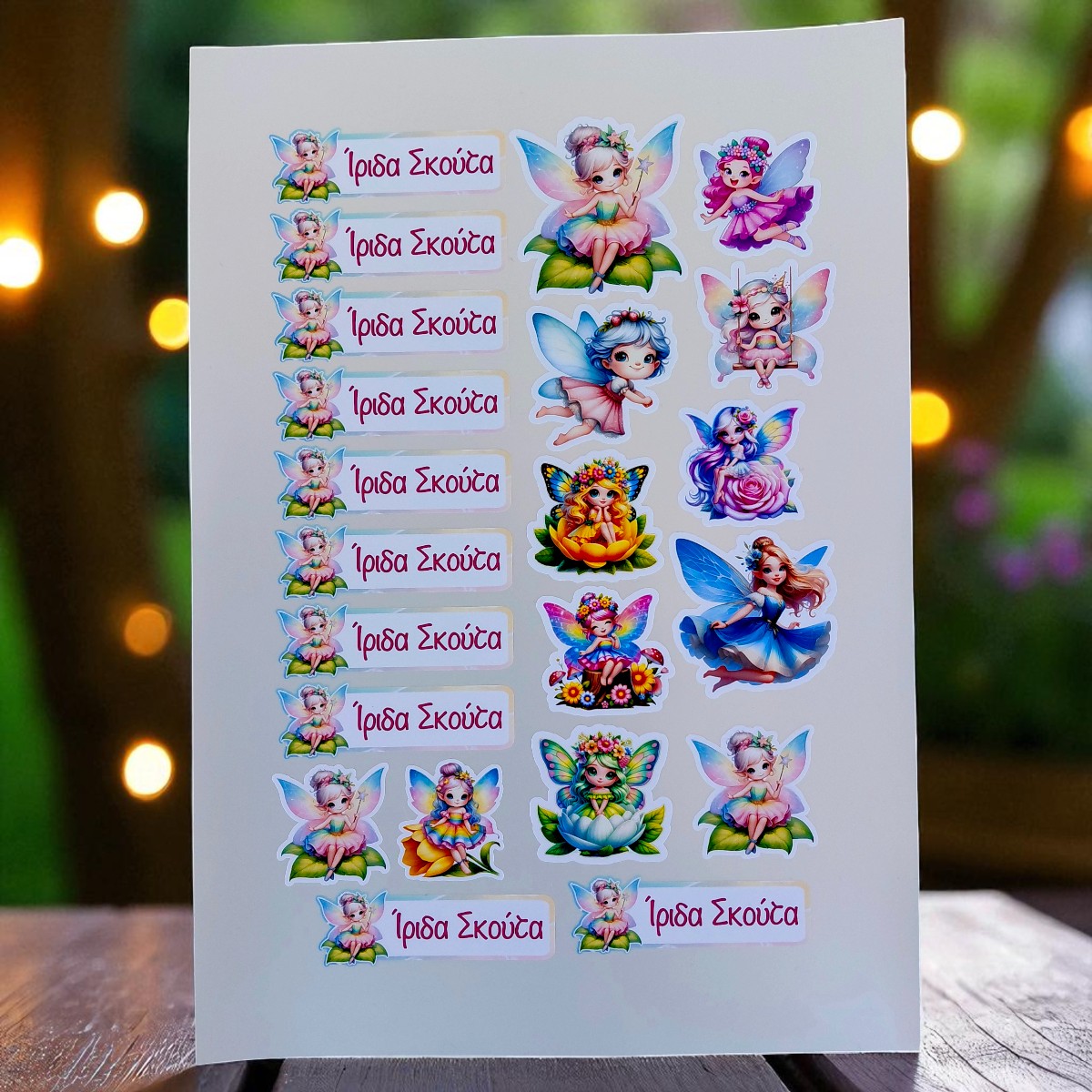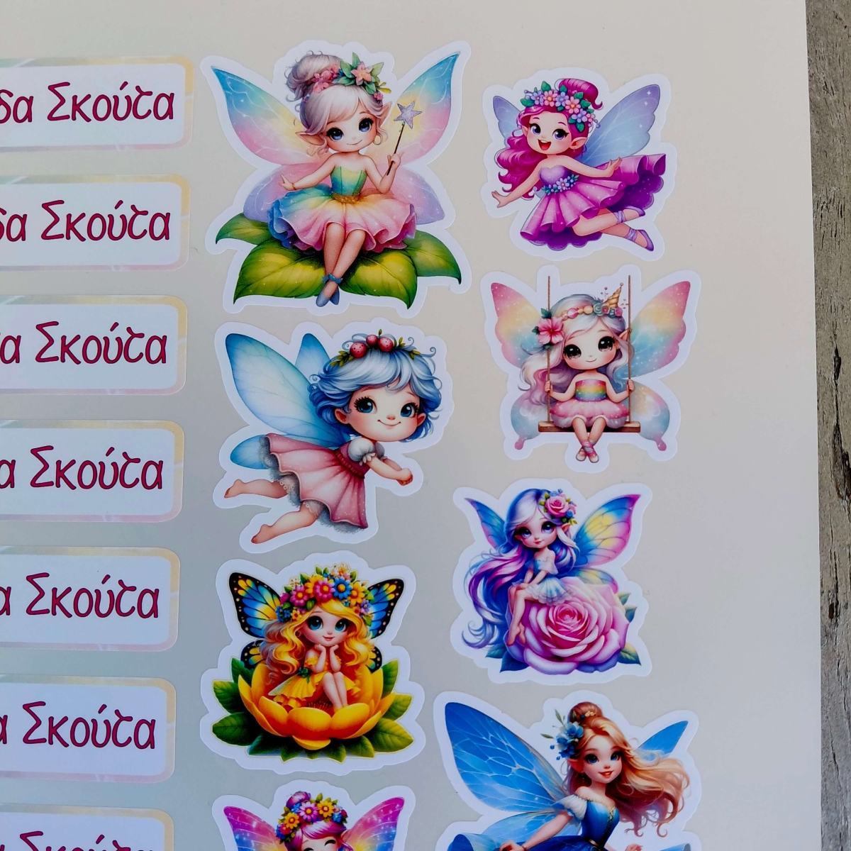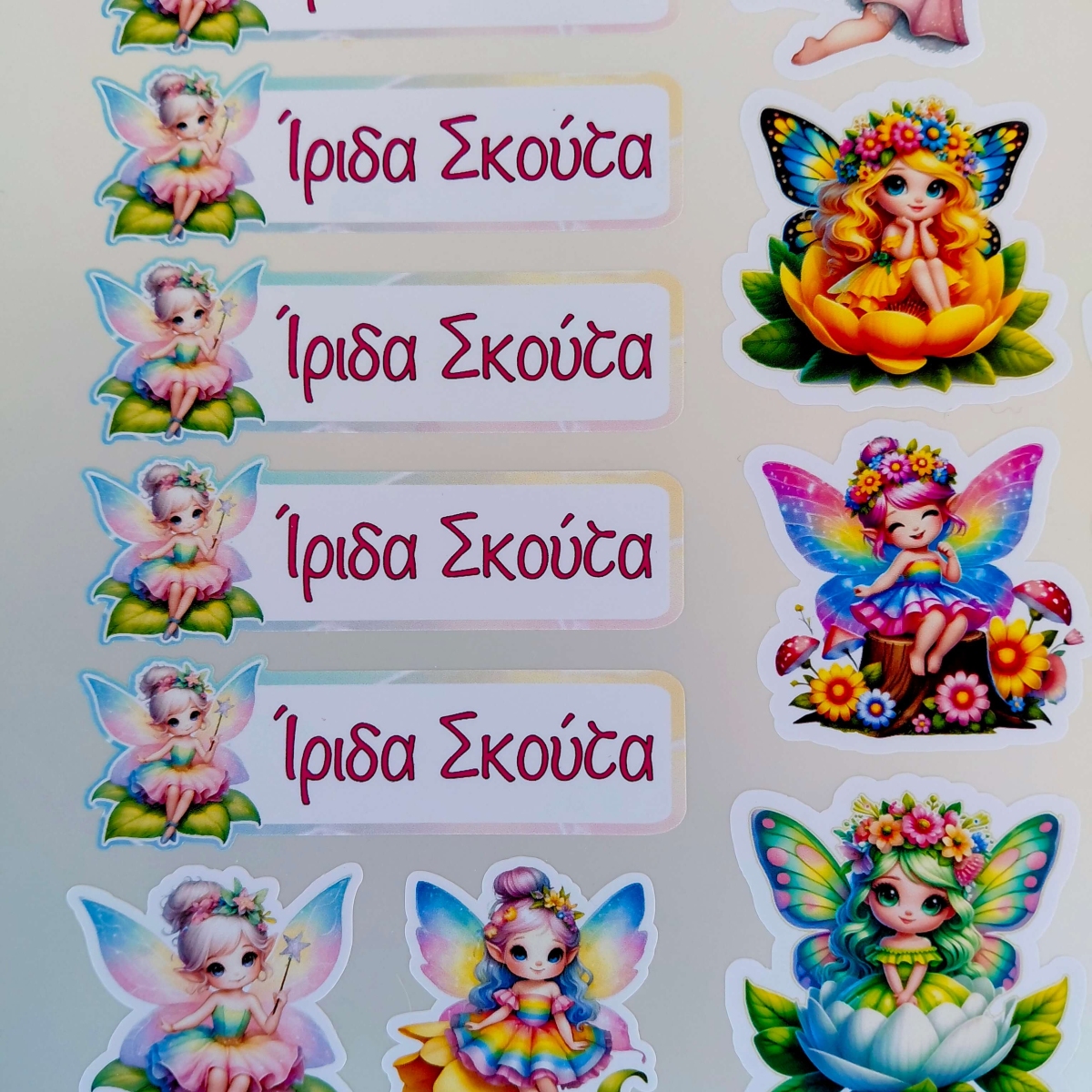 Αδιάβροχες αυτοκόλλητες ετικέτες με όνομα – Νεράιδες 🧚♀️. Ανθεκτικές, προσωποποιημένες και ιδανικές για σχολικά είδη, παγούρια, φαγητοδοχεία και παιχνίδια.