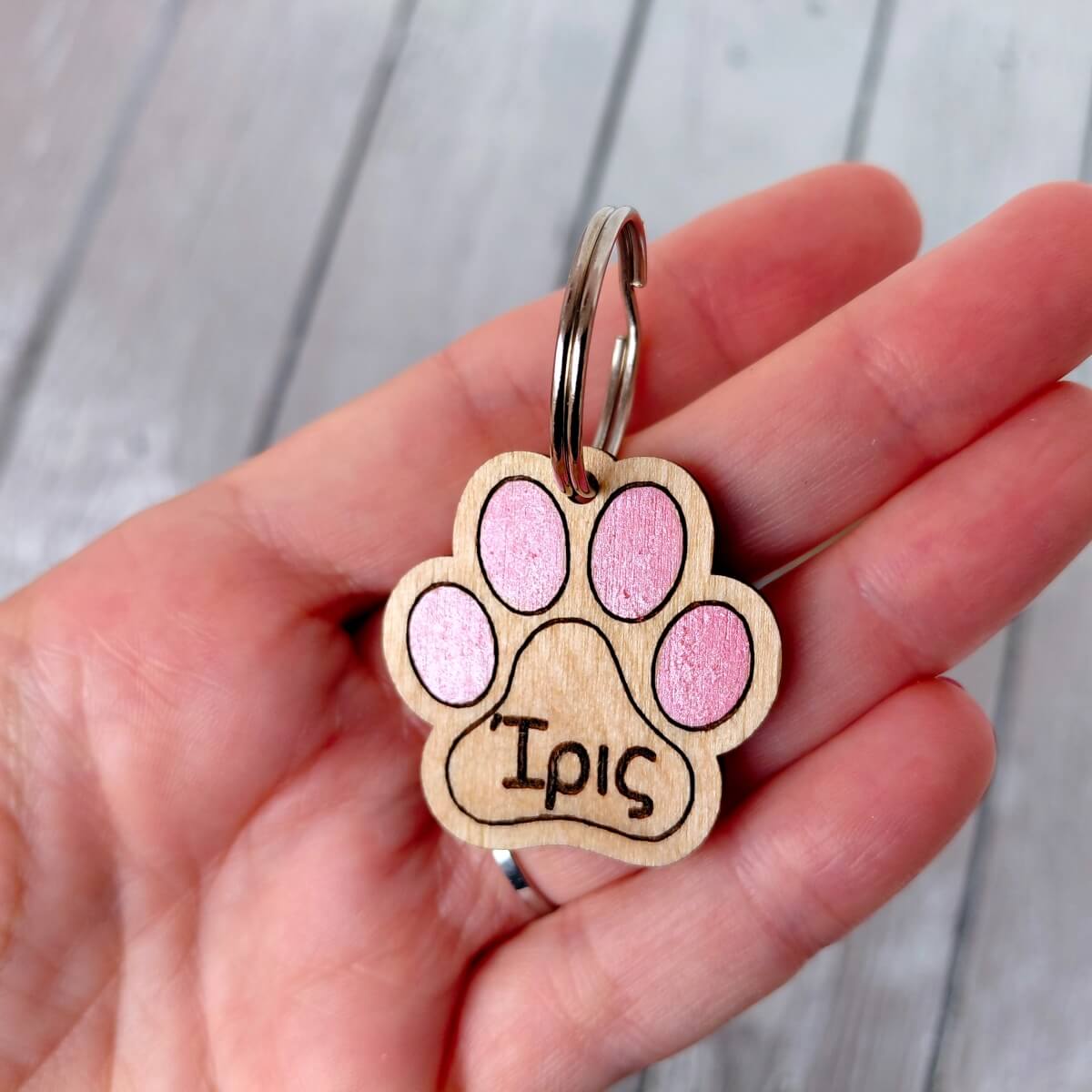 Χειροποίητη ξύλινη ταυτότητα σκύλου διπλής όψεως! Με όνομα μπροστά και αριθμό επικοινωνίας πίσω. Διαθέσιμη σε χρώμα της επιλογής σας, περασμένη με προστατευτικό βερνίκι για αντοχή και αδιαβροχοποίηση.