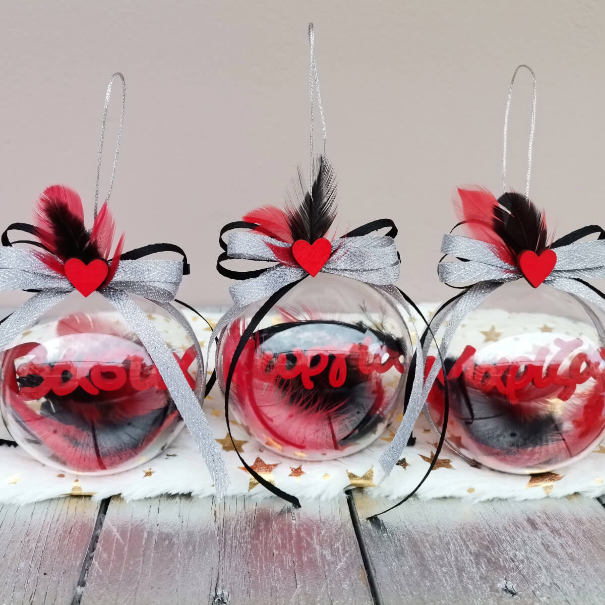 Η Χειροποίητη Χριστουγεννιάτικη Μπάλα Plexiglass με Όνομα και Φτερά σε κόκκινο και μαύρο είναι ένα στολίδι που συνδυάζει κομψότητα και συναίσθημα.