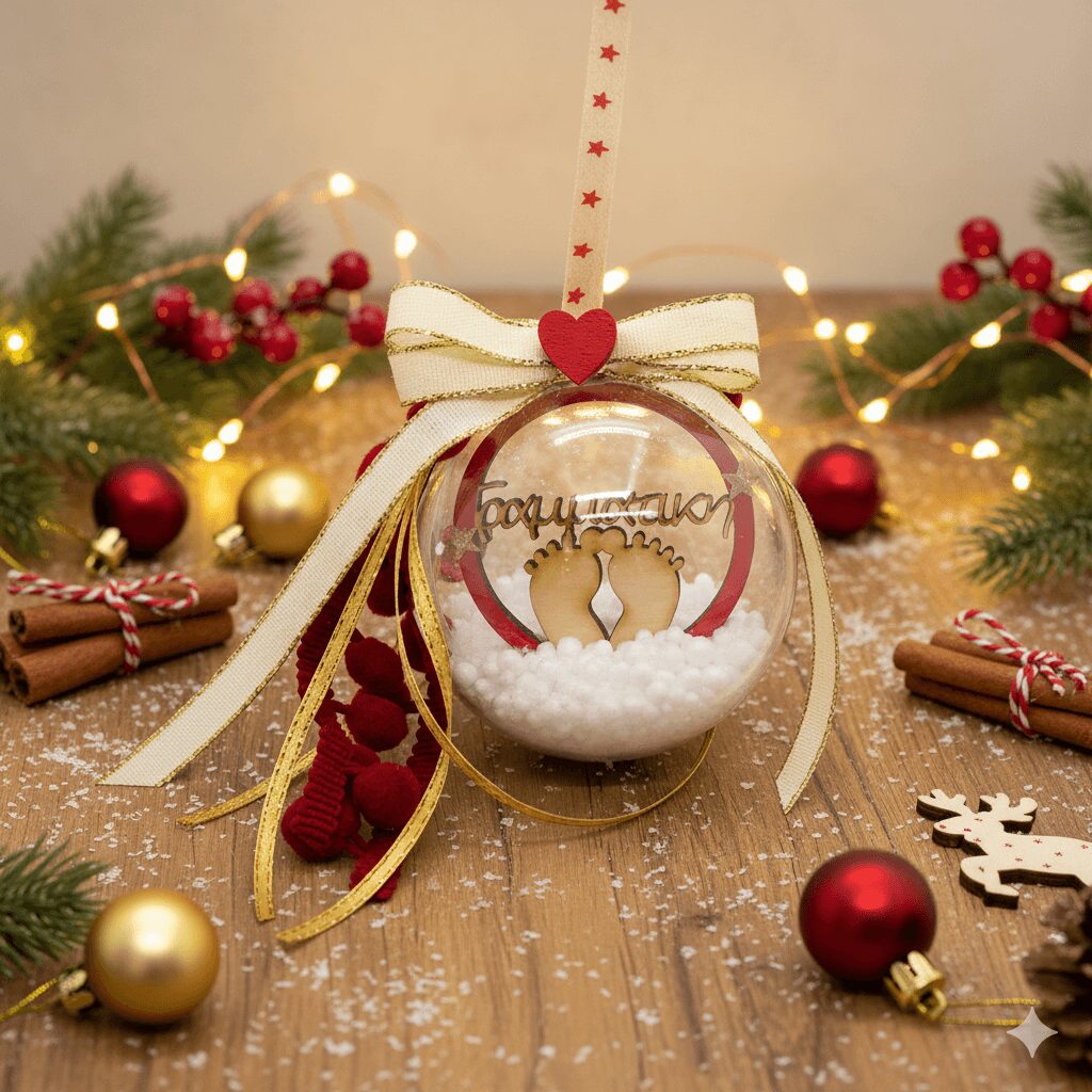 Χειροποίητη χριστουγεννιάτικη μπάλα από Plexiglass με τεχνητό χιόνι, ξύλινα πατουσάκια και το όνομα του μωρού. 💖