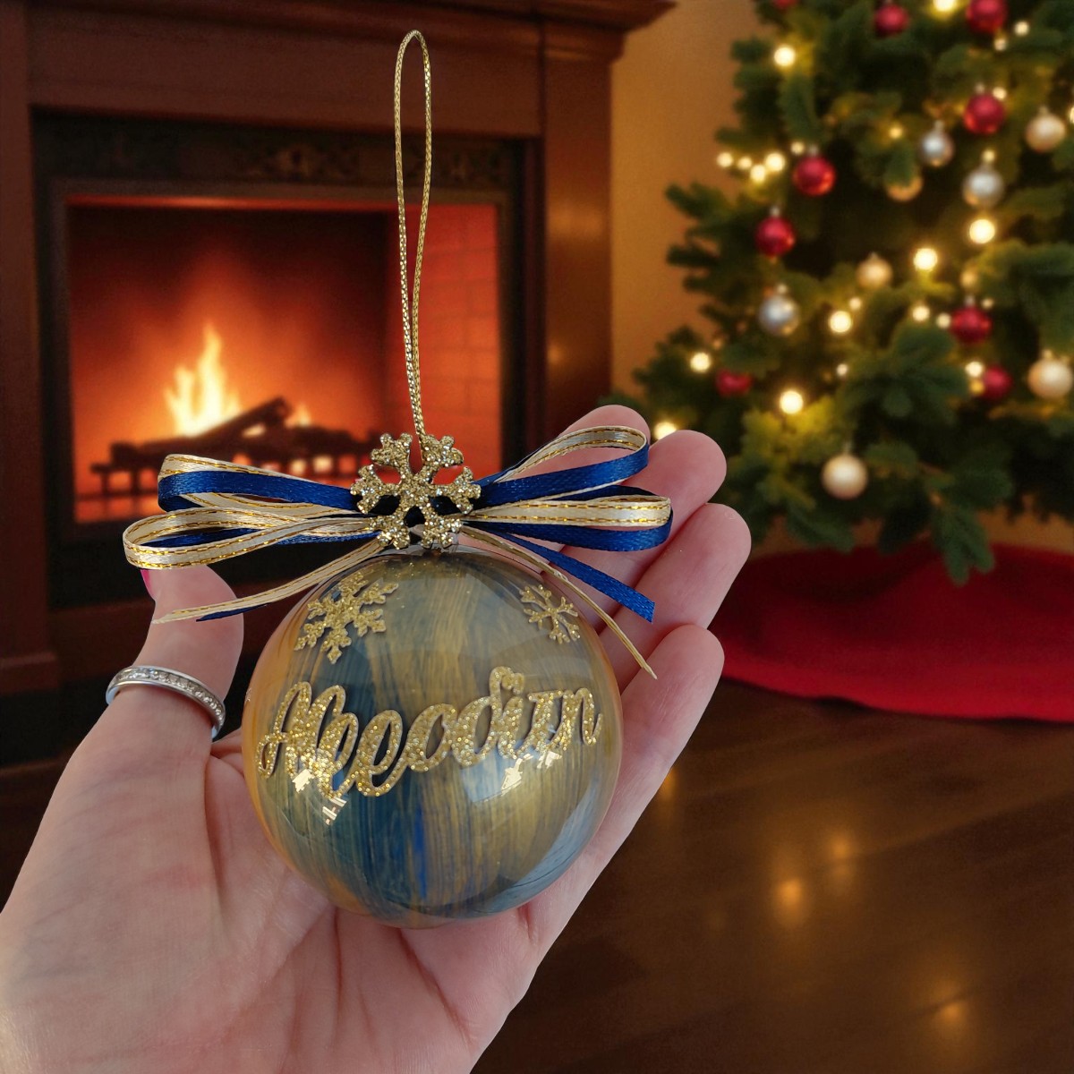 Η Χειροποίητη Χριστουγεννιάτικη Μπάλα Plexiglass “Προσωποποιημένη Γοητεία” στολίζει το δέντρο σας με κομψότητα και έντονη λάμψη, καθώς συνδυάζω χρυσές και μπλε αποχρώσεις με προσωποποιημένη καλλιγραφική επιγραφή απο glitter. Ιδανικό δώρο γεμάτο συναίσθημα 🎄✨.