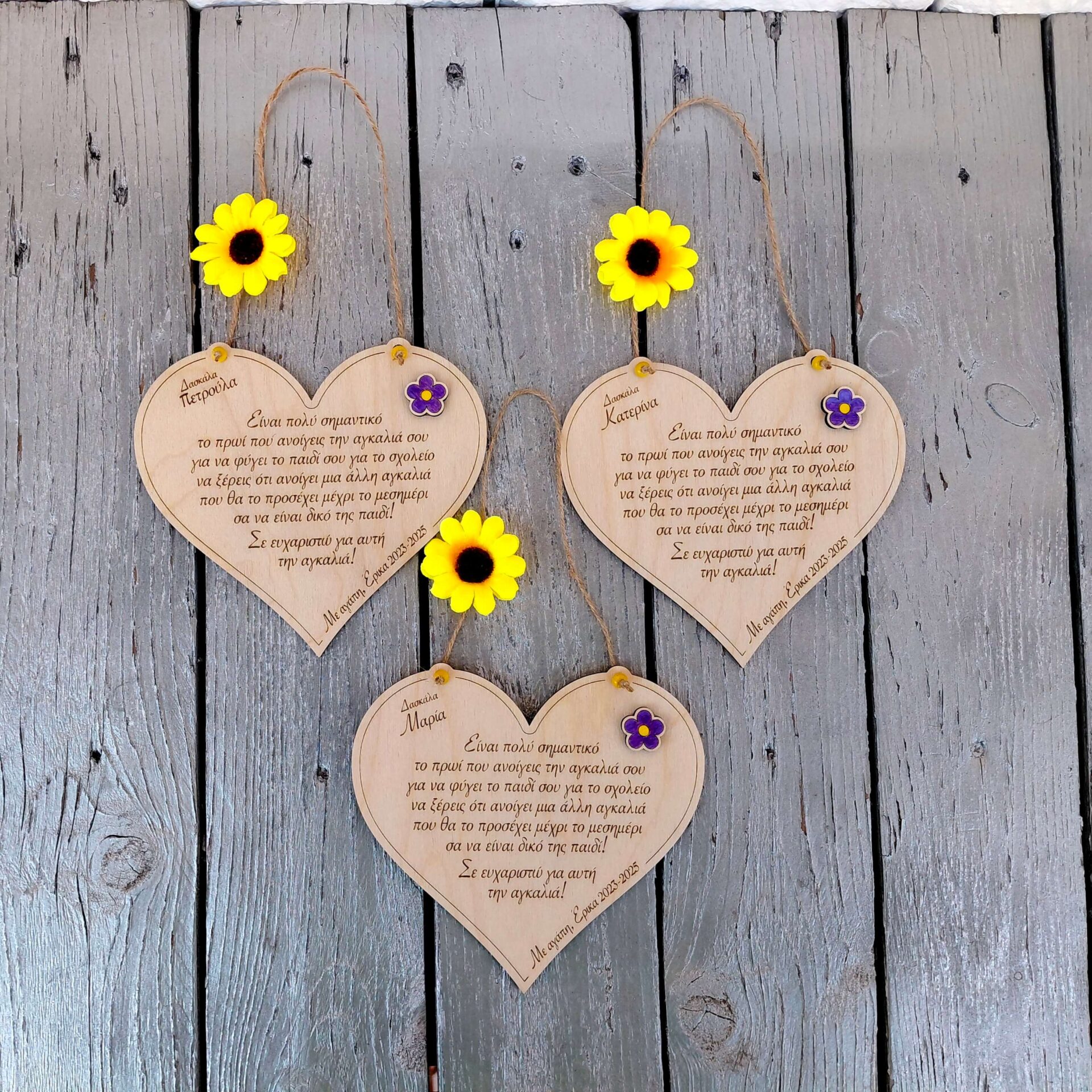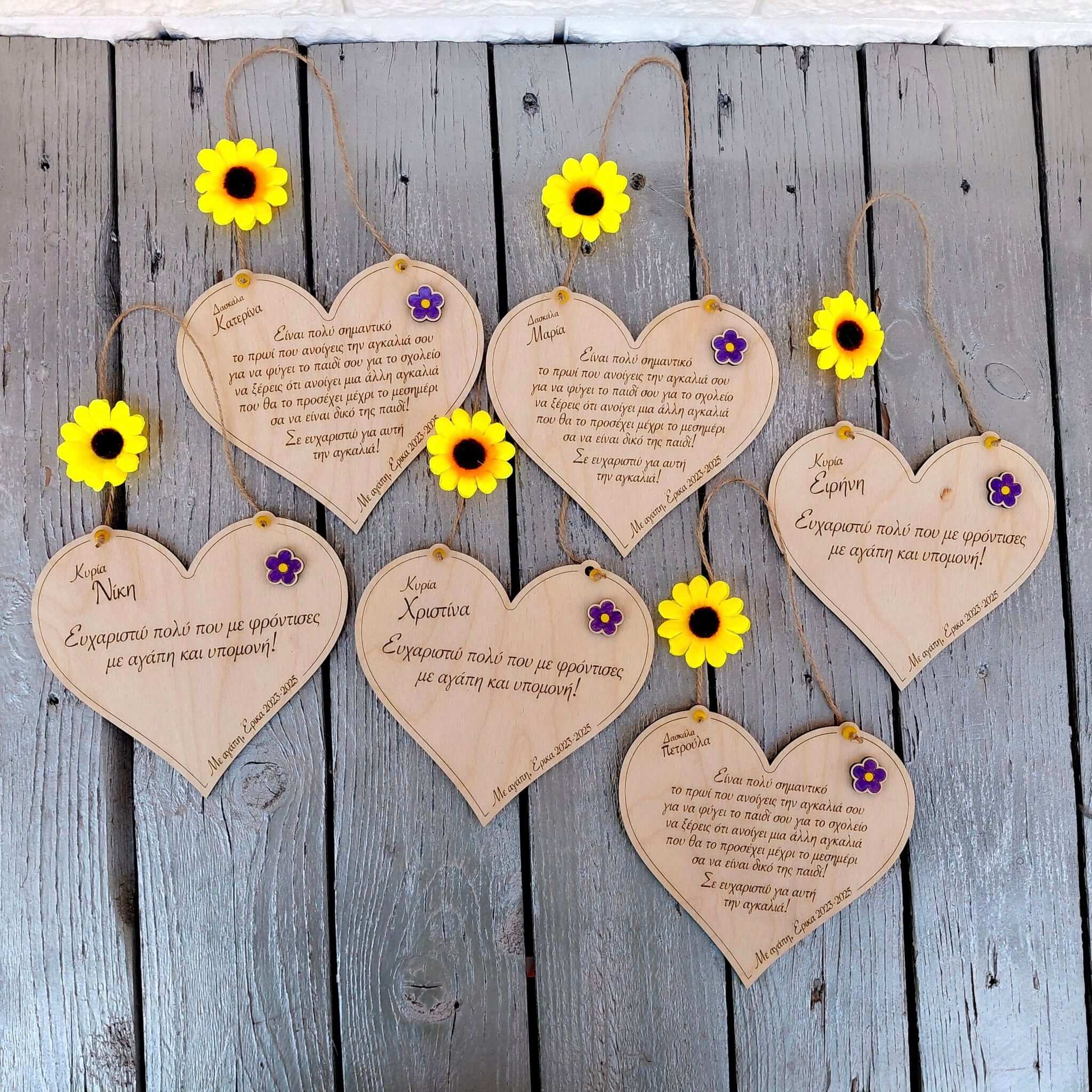 🌻 Χειροποίητο ξύλινο καδράκι σε σχήμα καρδιάς με ηλίανθο και προσωπική αφιέρωση. Μοναδικό δώρο για δασκάλα/ο, με ονόματα & έτος. Αναμνηστικό που μένει για πάντα! 🎁