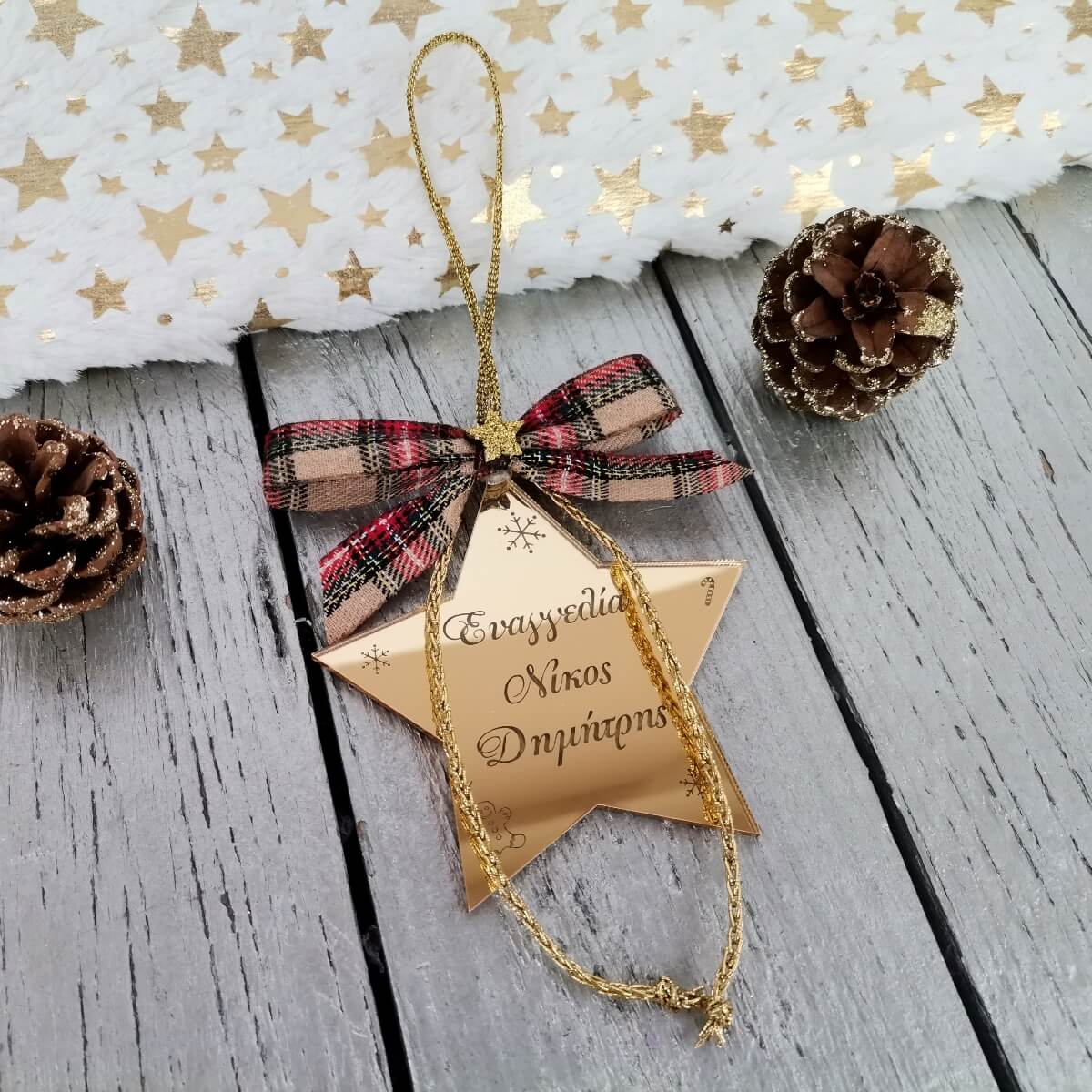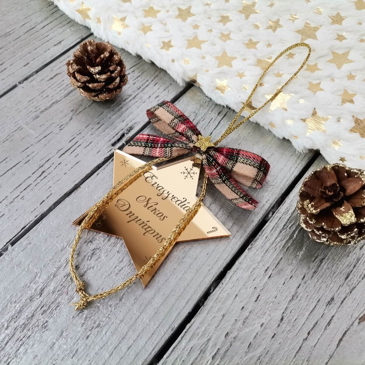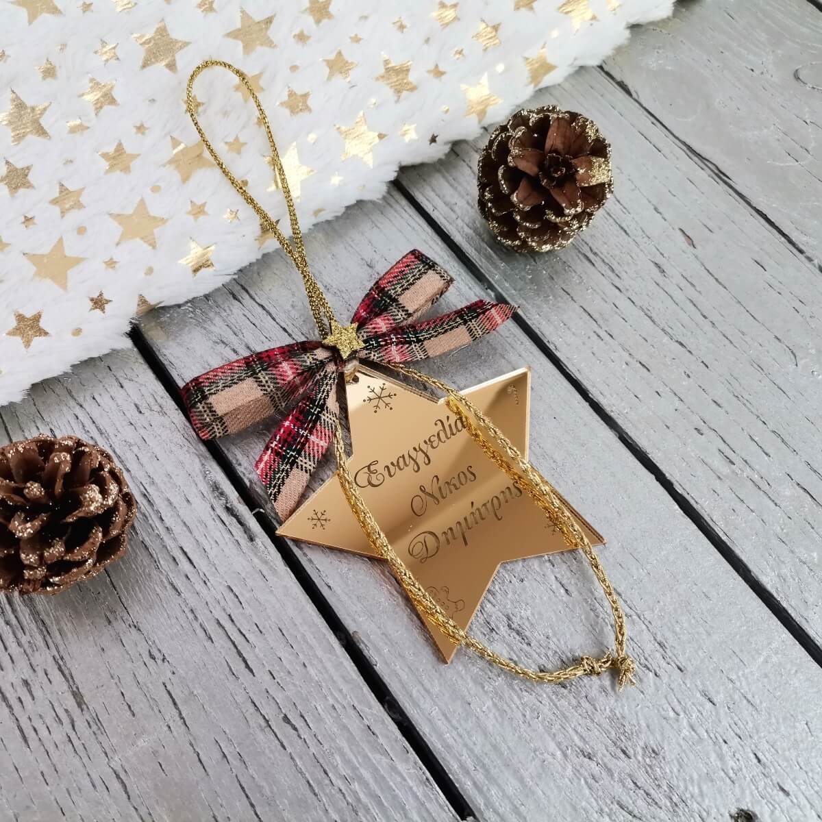 Χειροποίητο χρυσό αστέρι Plexiglass 9εκ, καθρέφτης, στολισμένο με καρό κορδέλα και προσωποποιημένο με όνομα ή αφιέρωση. 🎁