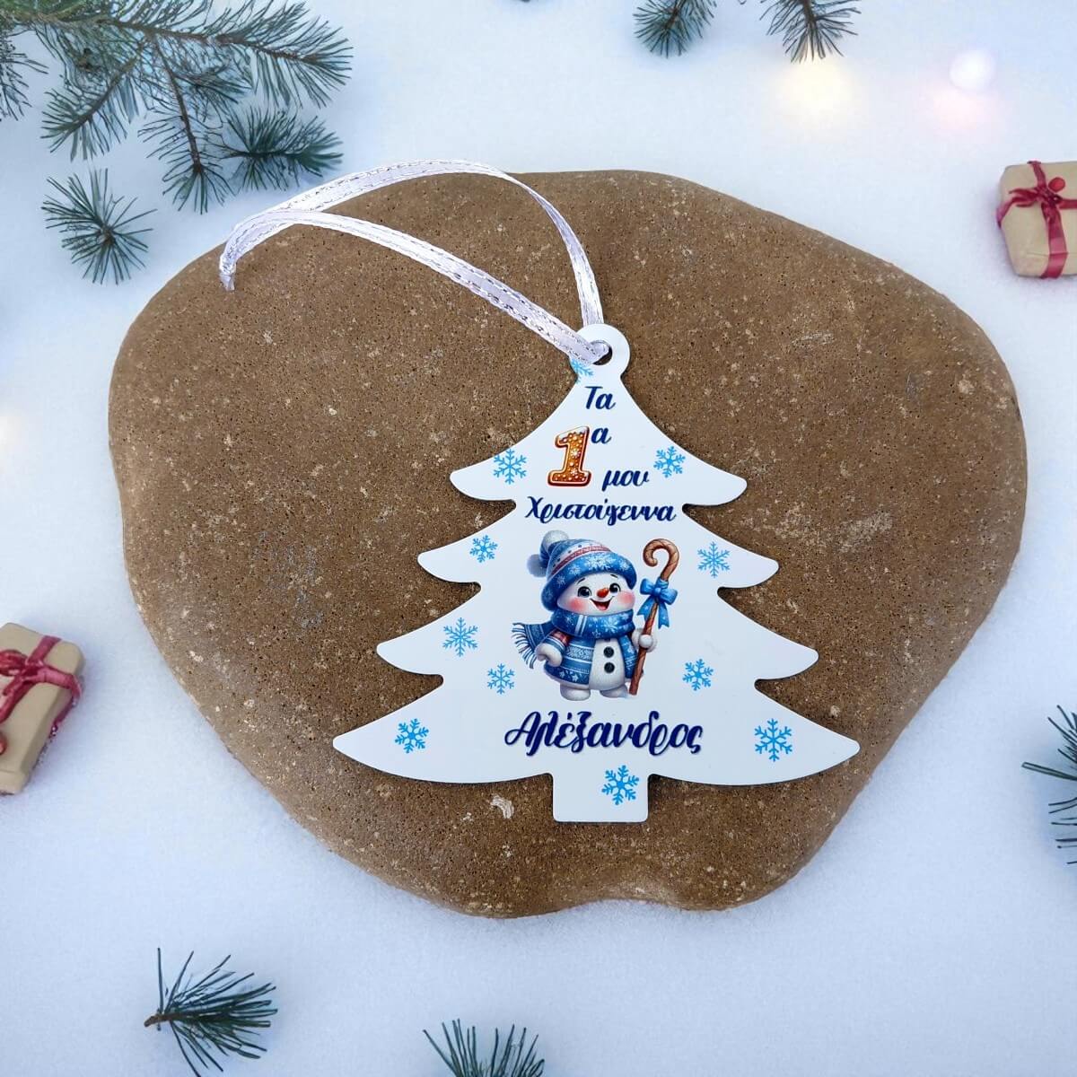 Χειροποίητο στολίδι δεντράκι με χιονάνθρωπο Τα Πρώτα μου Χριστούγεννα με Όνομα από αλουμίνιο και όνομα! 🎄