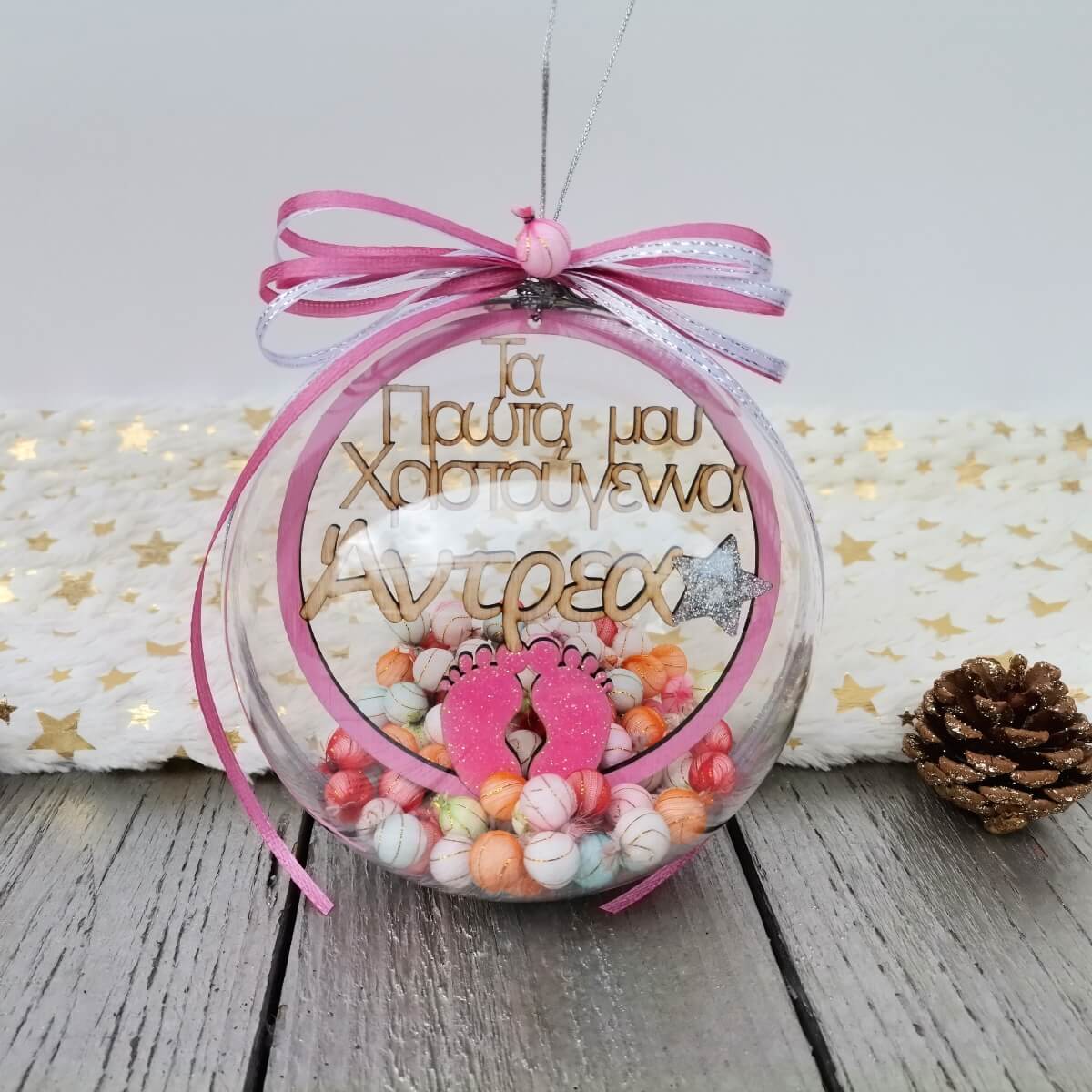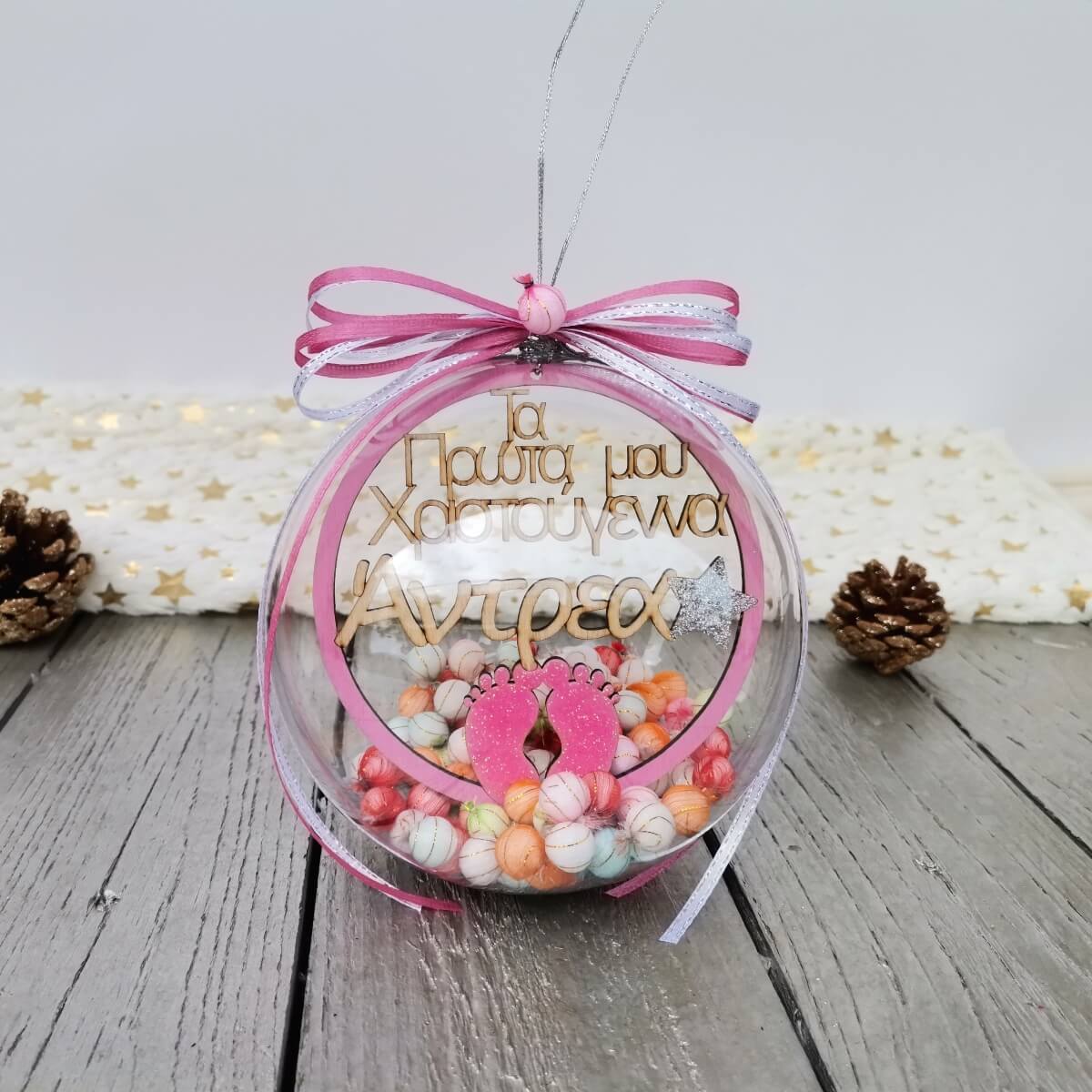 Η προσωποποιημένη μπάλα από plexiglass περιέχει πολύχρωμα καραμελάκια, ξύλινο πλαίσιο με τη φράση “Τα Πρώτα μου Χριστούγεννα” και το όνομα της επιλογής σας.